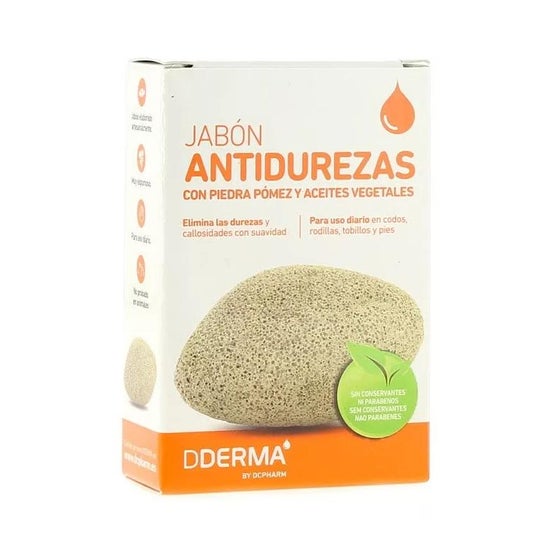 Dderma Savon Anti-Dureté 125g est un savon à la pierre ponce et enrichi en huiles végétales qui facilite l'élimination des callosités et des cors sur les pieds. Il est également indiqué pour enlever l'encre, la graisse mécanique ou la peinture de la peau. Contient 125g.