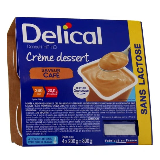 Delical Crème Dessert Hp HC Sans Lactose Café 4x200g est un dessert nutritionnel, associant plaisir gustatif et nutrition ciblée, destiné aux personnes ayant des besoins nutritionnels accrus.