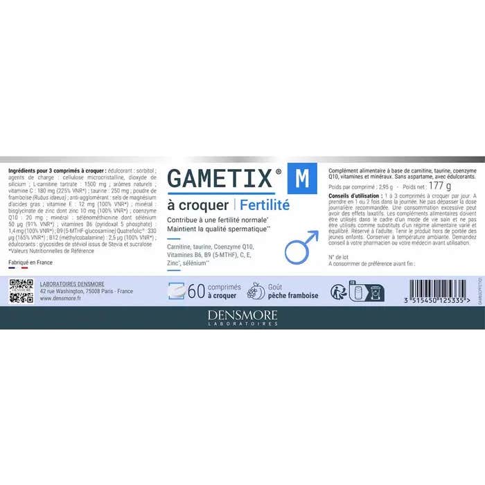 Densmore Gametix M Fertilité est un complément alimentaire conçu pour optimiser la fertilité masculine. Présenté sous forme de comprimés à mâcher, ce produit se distingue par sa formule complète et experte, qui inclut :