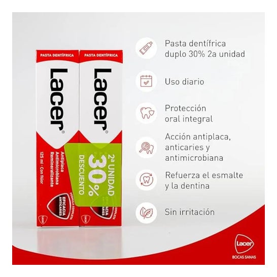 Lacer Toothpaste 2x125ml est un dentifrice pour adultes qui aide à prévenir les caries, la plaque dentaire et à protéger les gencives contre les irritations et les démangeaisons.