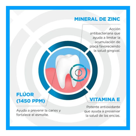 Grâce à sa formule riche en antiseptique oral (CPC) et en perméthol, son action est efficace contre la gingivite, car elle renforce les capillaires sanguins des gencives. De plus, la présence de fluor dans sa composition fait de ce dentifrice un allié dans la prévention des caries et l'élimination de la plaque et du tartre.