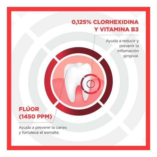 Il contient un puissant agent antibactérien grâce à la chlorhexidine qui élimine la plaque dentaire, principale cause de la douleur des gencives. Il aide à la réduction des saignements grâce à la présence de perméthol, renforce les capillaires sanguins des gencives et favorise la réduction rapide des symptômes de la gingivite.