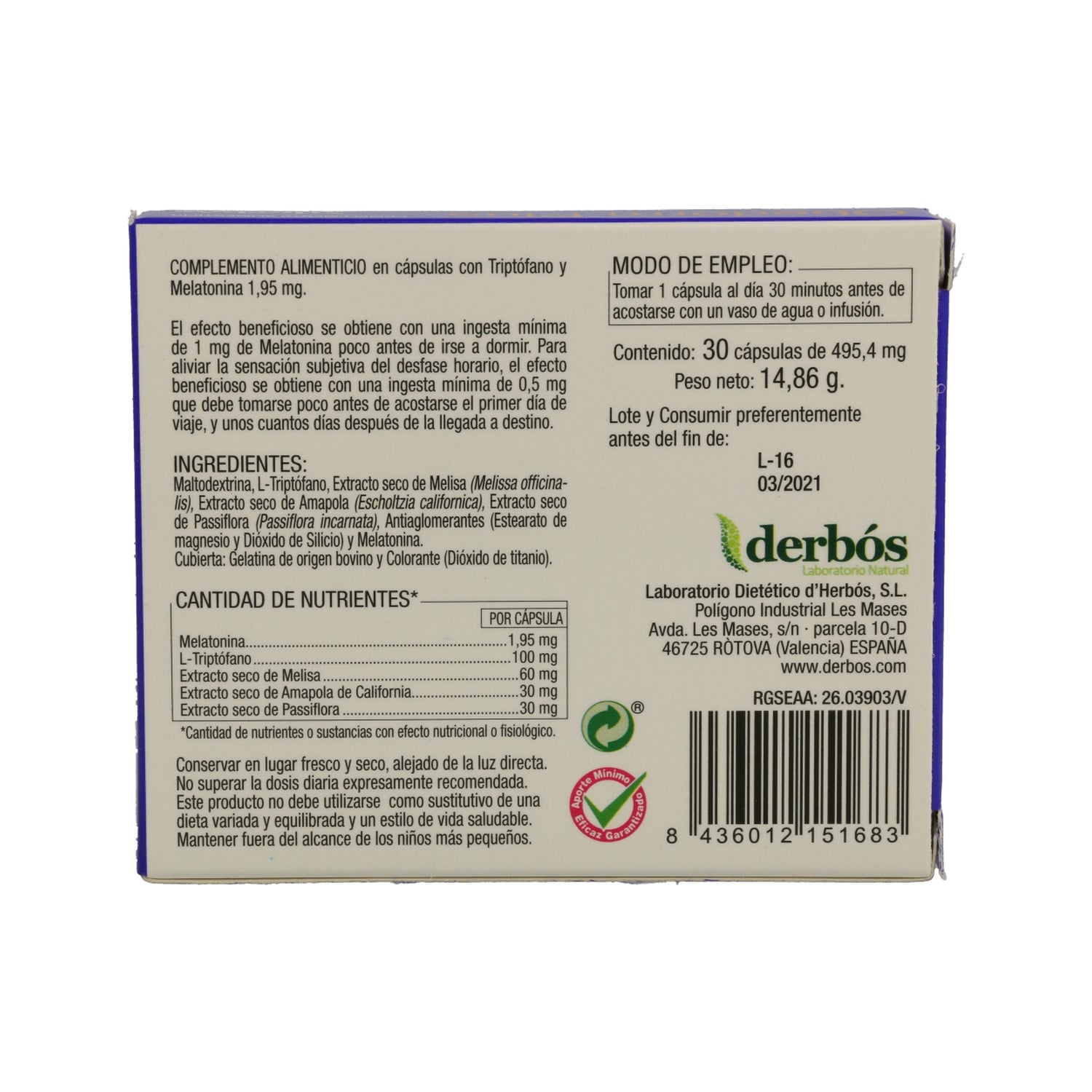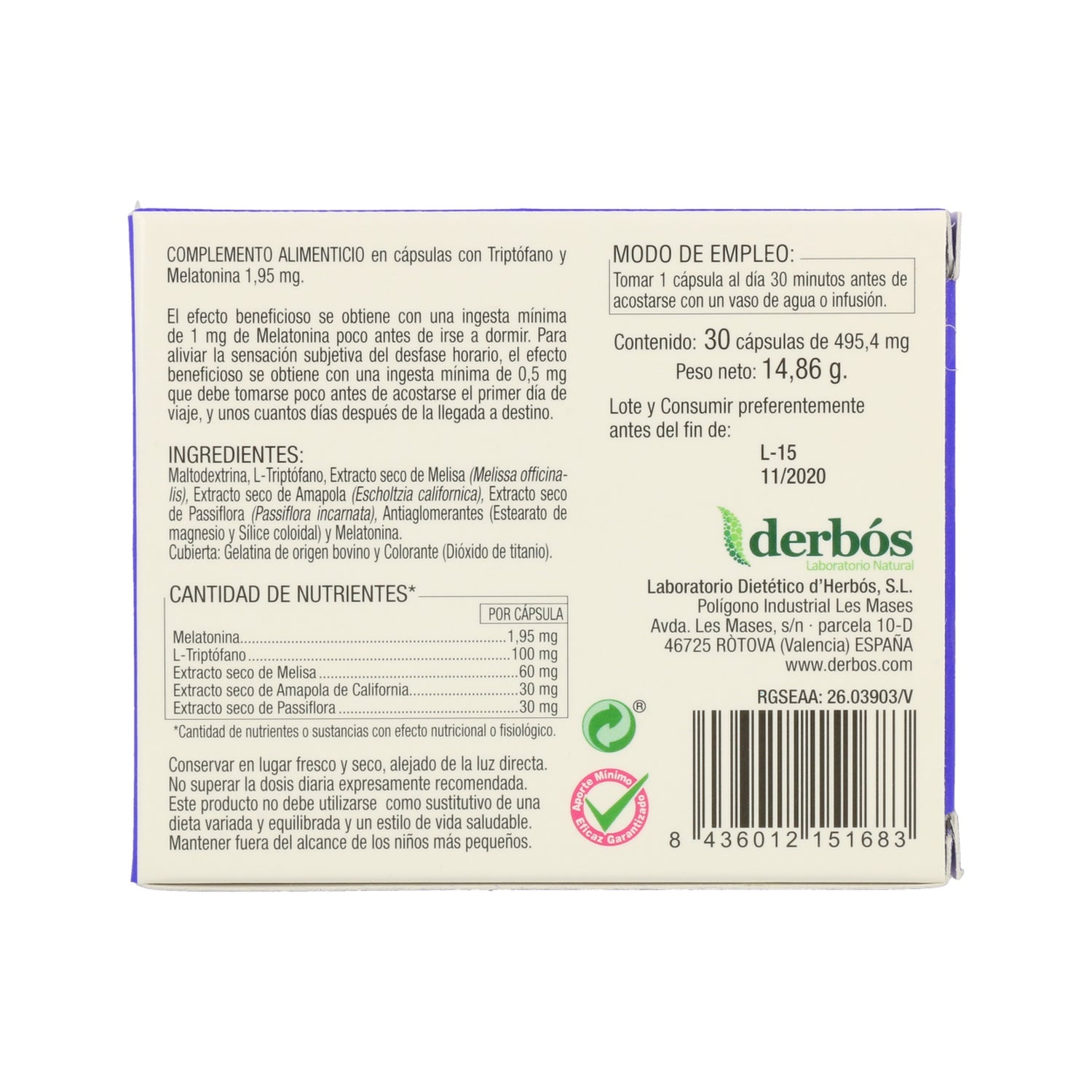 1 MG DE MÉLATONINE. 100 mg de l-tryptophane. 60 mg d'extrait sec de mélisse (acide rosmarinique à 2%). 30 MG D'EXTRAIT SEC DE PAVOT DE CALIFORNIE. 30 MG D'EXTRAIT SEC DE PASSIFLORE (3% VITEXINE).