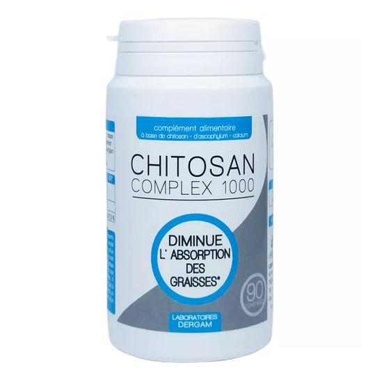 - Le Chitosan contenu dans les Chitosan Complexe 1000 des laboratoires Dergam est une fibre alimentaire (mélange de planctons) à 96% pure reconnue pour favoriser la captation des graisses et aider à empêcher leur assimilation pour être directement éliminées par les voies naturelles.