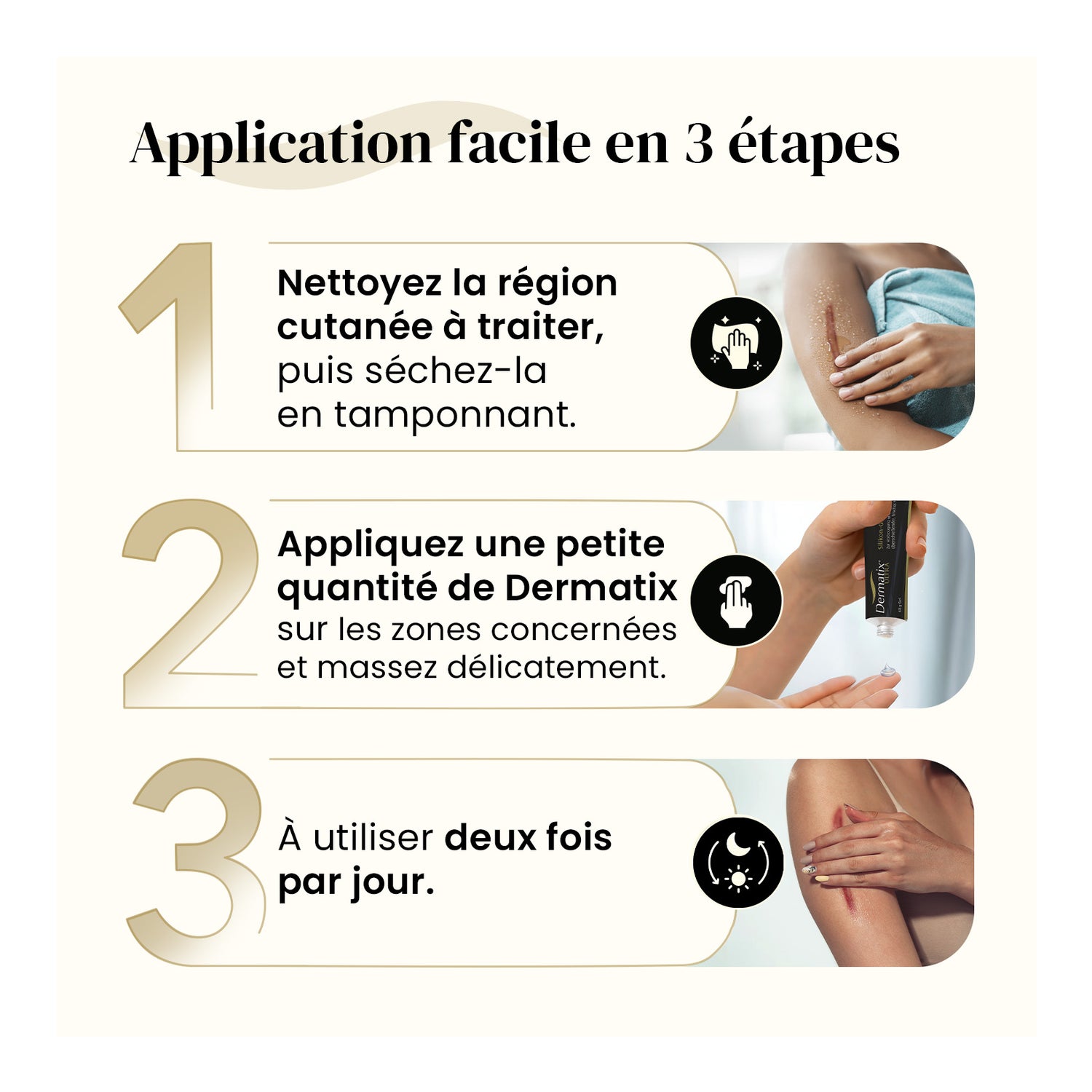 Ses principes actifs aident à hydrater la peau, à favoriser sa régénération, à réduire l'inflammation des cicatrices et à apaiser les démangeaisons causées par les processus de cicatrisation.