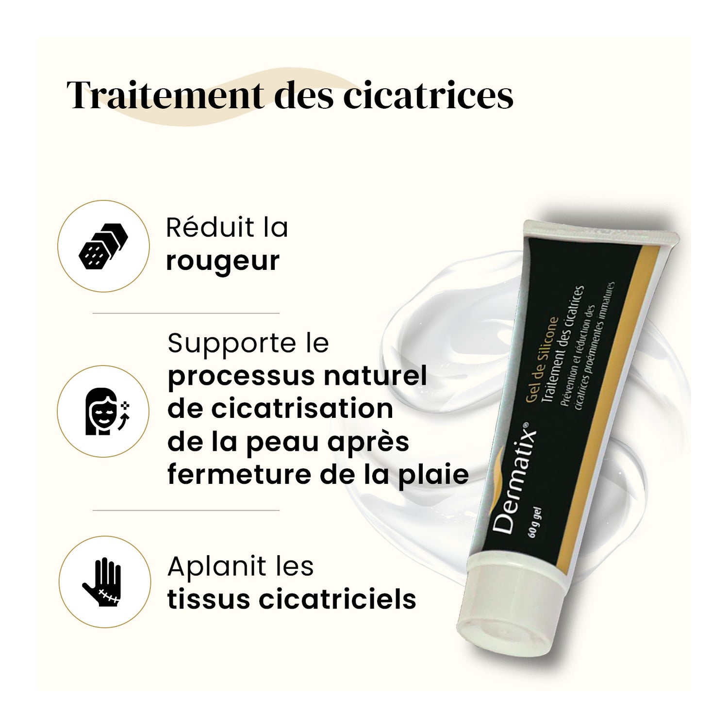 Dermatix Gel De Silicone 60g est un gel pour le corps et le visage qui aide à réduire et à prévenir la formation de cicatrices hypertrophiques, en soulageant la douleur et les démangeaisons.