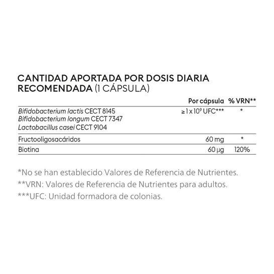Complément alimentaire qui contribue à maintenir la peau dans des conditions normales. Il est composé d'un mélange de bifidobactéries et de lactobacilles qui favorisent l'équilibre du microbiote intestinal. L'utilisation de probiotiques pour modifier le microbiote intestinal permet de réduire l'intensité et la durée des poussées de dermatite atopique, ainsi que l'étendue et l'intensité de l'eczéma.