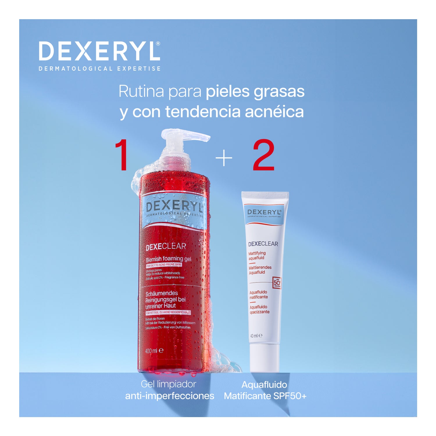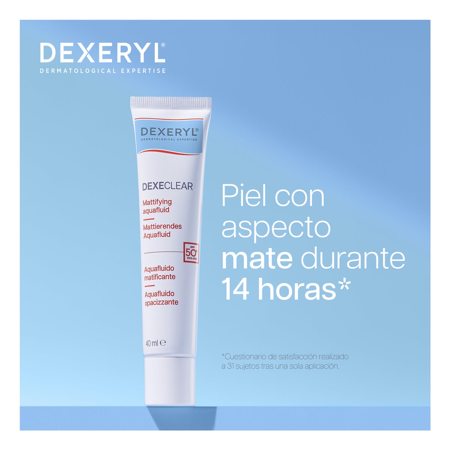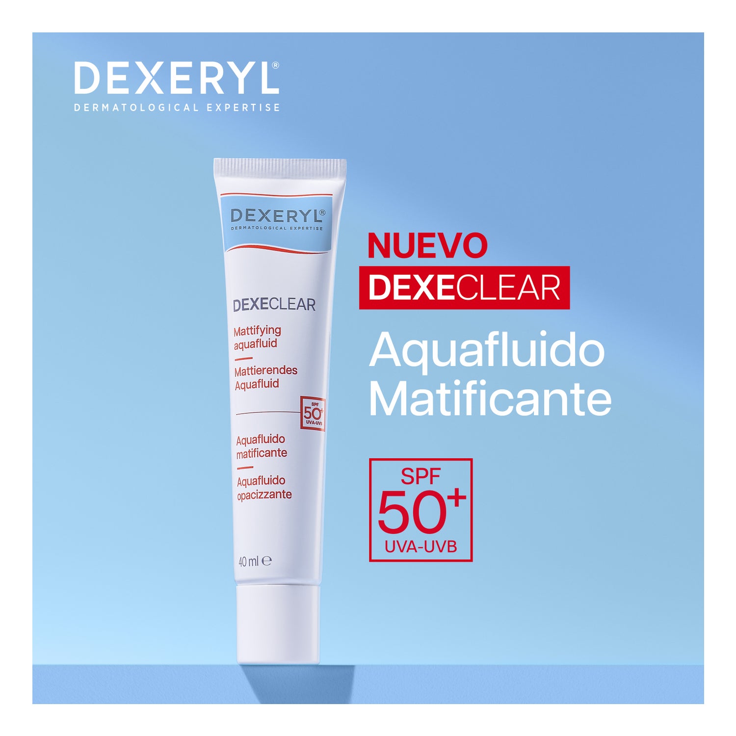 DEXECLEAR Aquafluido Matifiant FPS 50+ offre trois bénéfices essentiels : matifie, hydrate et protège la peau des rayons UV. Sa formule contient 1 % de P-Refinyl®, qui aide à réduire la taille des pores, de l'acide glutamique avec un effet séborégulateur et un complexe filtrant UVB/UVA. Tout cela procure une absorption immédiate pour une sensation de toucher sec.