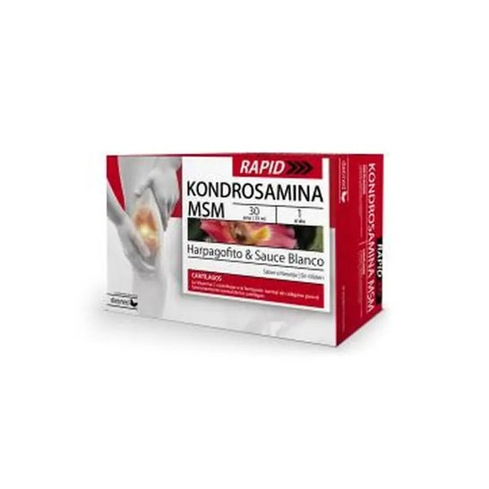Complément alimentaire formulé à base de glucosamine et de chondroïtine. Boîte de 30 ampoules buvables. Aide à maintenir les tissus et les articulations dans des conditions normales. On attribue à ses ingrédients des propriétés anti-inflammatoires et régénératrices. Convient aux adultes.