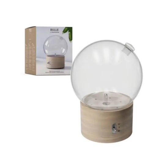 Lediffuseur à sec Pranarôm Bulle est fabriqué à partir de matériaux nobles tels que le bois et le verre. Il permet de diffuser très facilement des huiles essentielles pures sans eau.