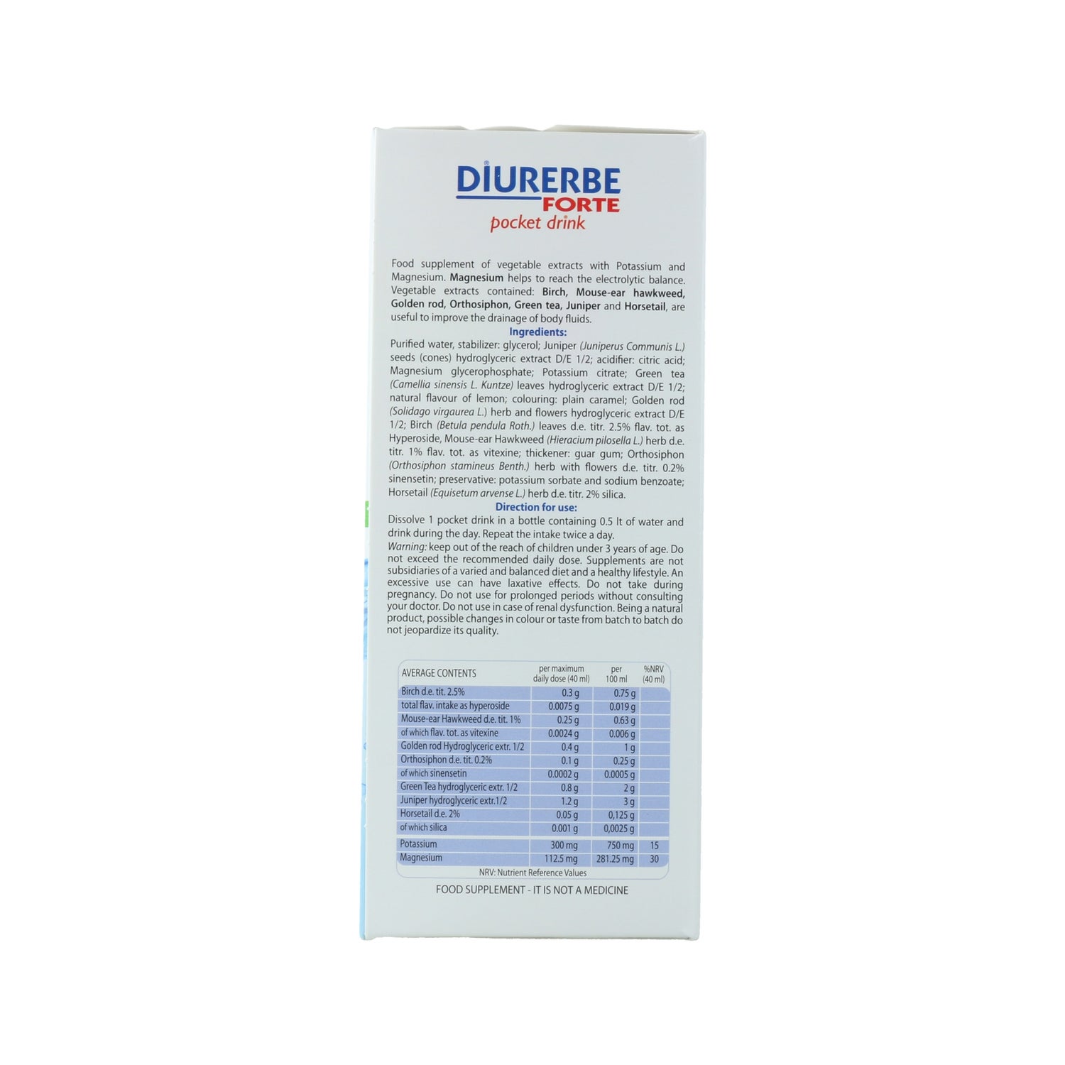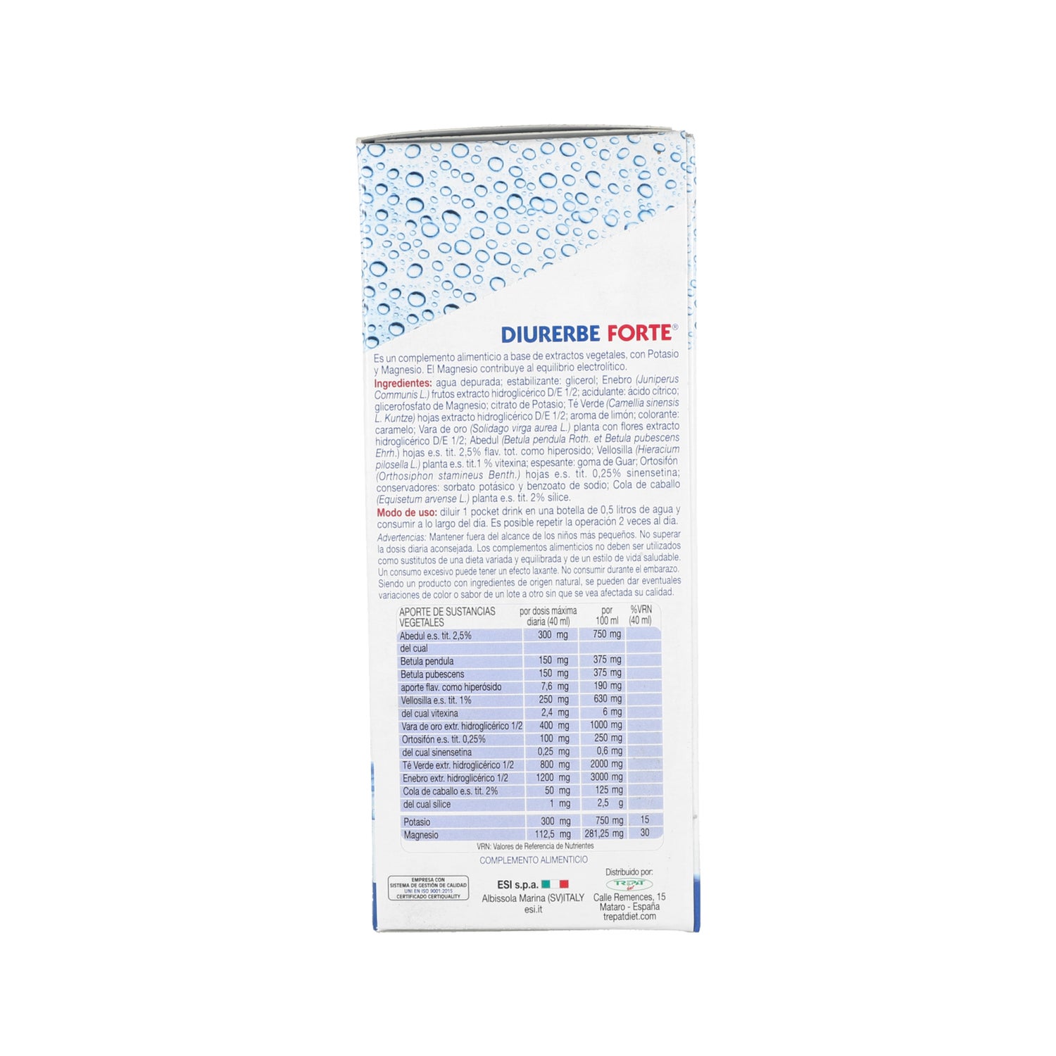 Diurerbe Forte Pocket Drink aide à expulser l'excès de liquide accumulé dans le corps, vous rendant plus léger et plus confortable. Il réduit les oedèmes des articulations inférieures produites à cause d'une mauvaise circulation ou d'une mauvaise alimentation, vous laissant une légère saveur citrique.