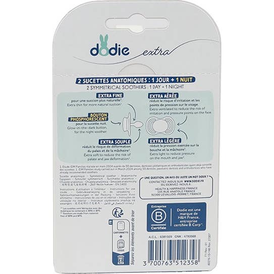 Dodie Extra Sucette Anatomique 0-6M F1 Jour Nuit est un pack qui comprend deux sucettes conçues pour les bébés de 0 à 6 mois, une pour le jour et une autre pour la nuit. La sucette nocturne dispose d'un bouton qui brille dans l'obscurité, facilitant sa localisation par les parents sans avoir besoin d'allumer la lumière.