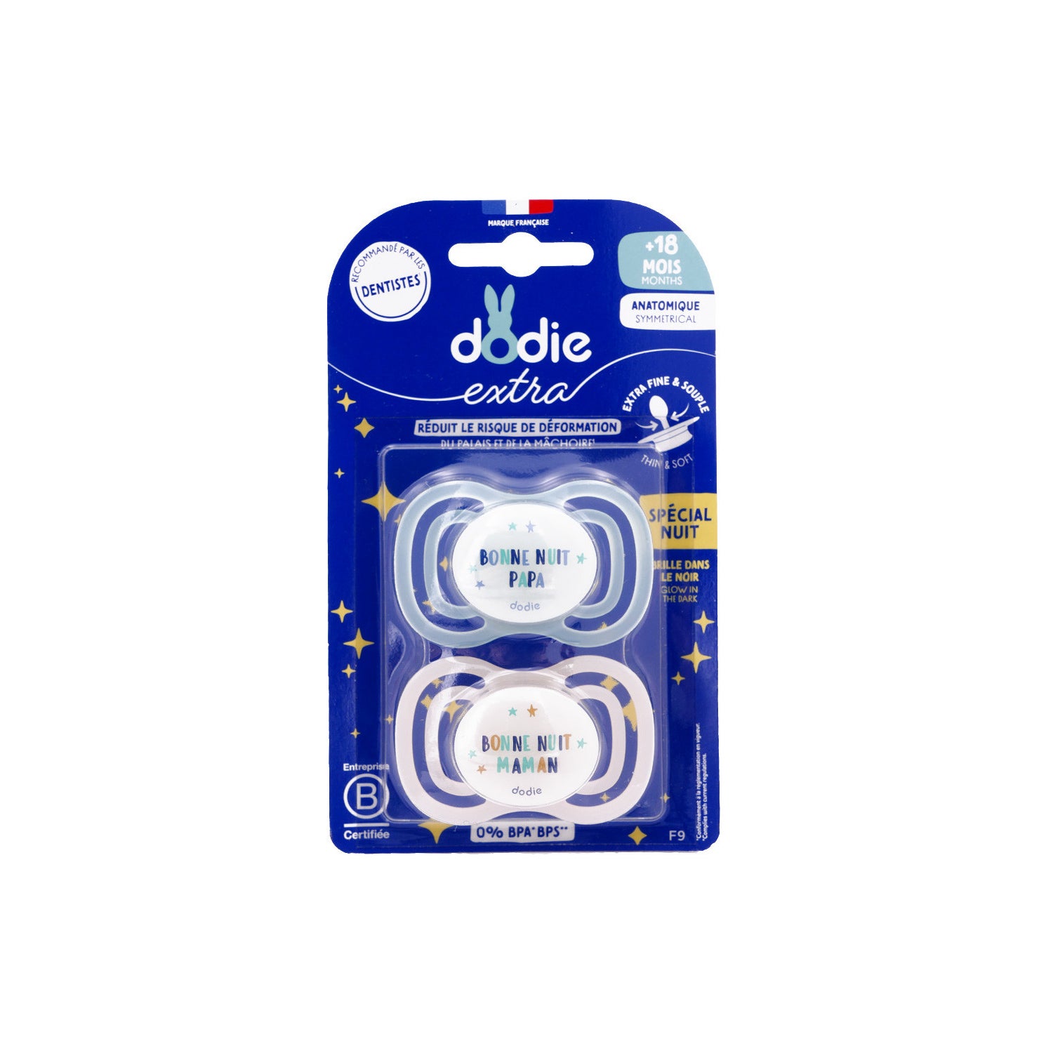 La Dodie Extra Sucette Anatomique +18M F9 Fine Nuit est recommandée par des dentistes et est conçue pour accompagner le développement sain du bébé.