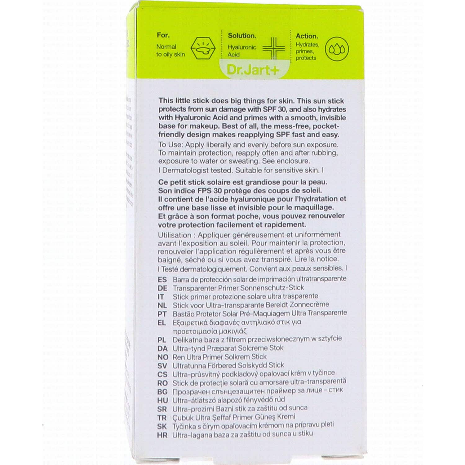 Dr Jart+ Every Sun Day Stick Solar Primer Transparent SPF 30 19g est un stick solaire innovant d'origine coréenne qui combine protection et soin de la peau dans une texture légère. Ce produit possède un facteur de protection solaire de 30 et est formulé avec de l'acide hyaluronique, ce qui apporte hydratation et aide à adoucir l'apparence des pores.