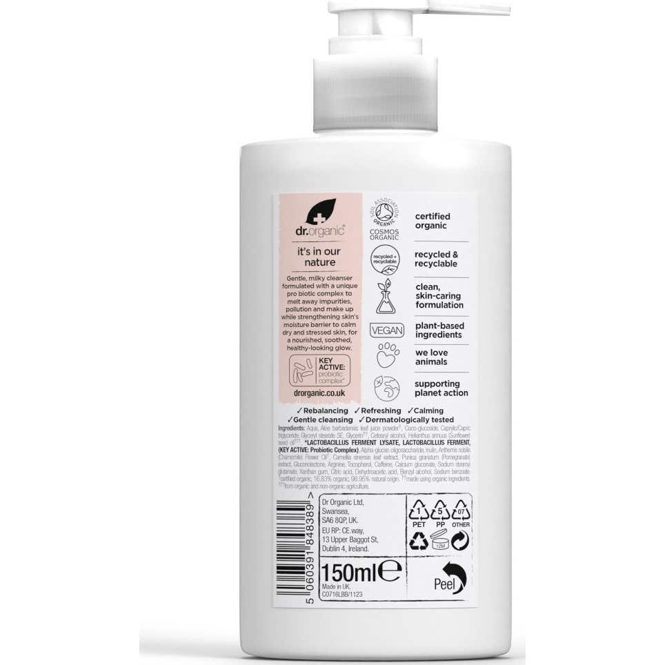 Dr. Organic Skin Calm Probiotic Crème Nettoyante est un nettoyant doux à la texture laiteuse, conçu pour éliminer efficacement les impuretés, le maquillage et la pollution, sans compromettre la barrière naturelle de la peau. Sa formule comprend des probiotiques et des prébiotiques, qui aident à renforcer la microbiote cutanée, favorisant ainsi une peau nourrie, apaisée et équilibrée.