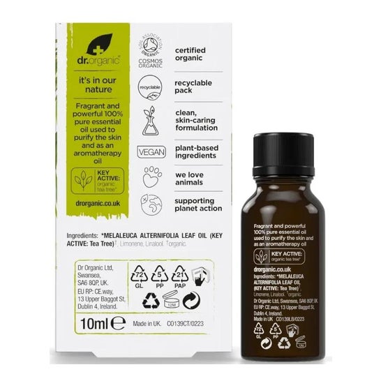 Dr Organic Pure Tea Tree Oil 10ml est une huile antibactérienne et purifiante riche en Terpinen-4-ol, un principe actif aux propriétés antiseptiques. Elle peut être appliquée directement sur les imperfections, les boutons ou les piqûres. Elle peut également être utilisée comme huile aromatique.