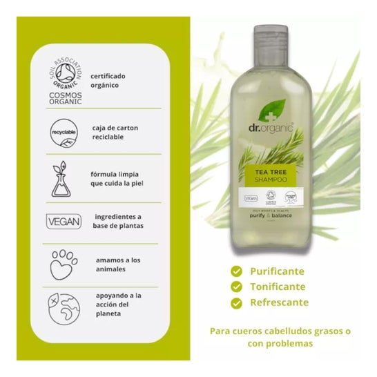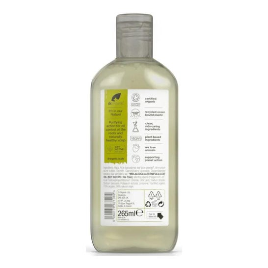 Le shampooing Dr Organic Tea Tree 265ml est riche en Terpinen-4-ol, un principe actif qui lui confère des propriétés antiseptiques. Enrichi en aloe vera, ce shampooing a une action purifiante et réparatrice, qui permet d'apaiser les démangeaisons et de stimuler le cuir chevelu. Particulièrement adapté aux cheveux et cuirs chevelus gras et/ou à pellicules.