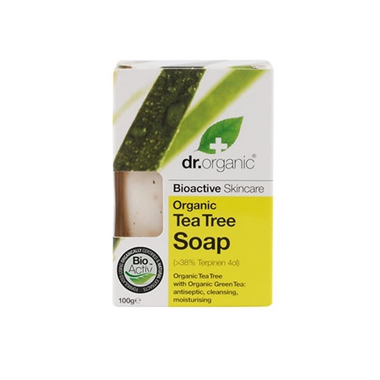 Le savon Dr Organic Tea Tree 100g est un savon antibactérien formulé à partir d'huile d'arbre à thé biologique riche en Terpinen-4-ol, un principe actif qui lui confère des propriétés antiseptiques. Enrichi en feuilles de thé vert, il est doté d'une forte action nettoyante et antioxydante.