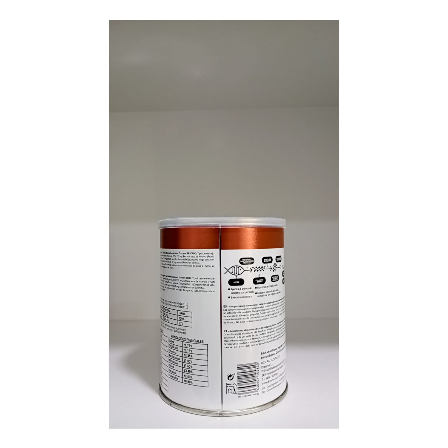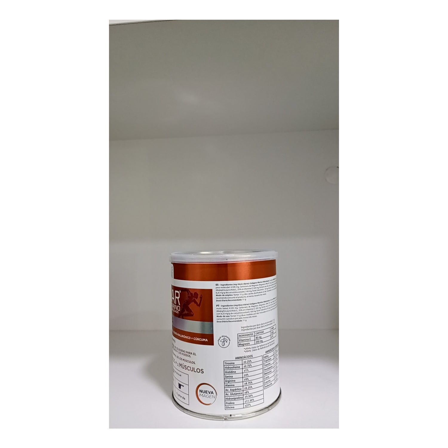 COLLAGÈNE MARIN HYDROLYSÉ, CARBONATE DE MAGNÉSIUM, EXTRAIT SEC DE CURCUMA, VITAMINE C, ACIDE HYALURONIQUE, ARÔME VANILLE ET SUCRALOSE.