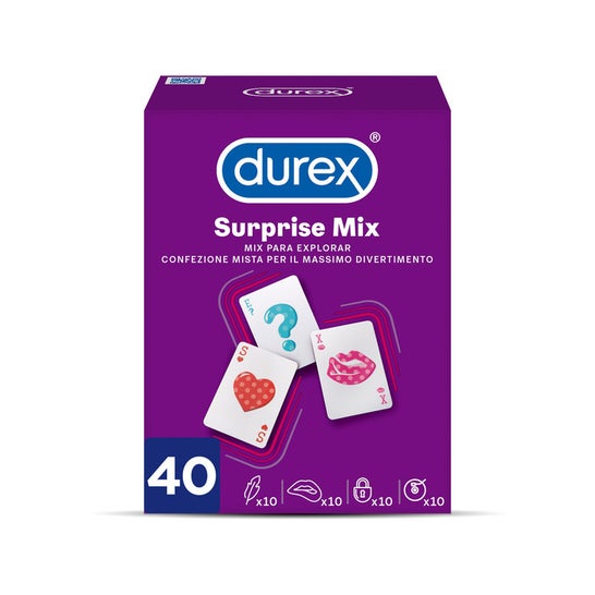 Durex Surprise Mix 40 pcs est un pack composé d'une sélection de préservatifs assortis pour explorer différentes sensations et ajouter un plaisir supplémentaire aux rapports sexuels. Ce pack contient:10x Give me pleasure.10x Extra safe.10x Stimulating.10x Sensitive.Tous ces préservatifs sont transparents, en latex de caoutchouc naturel, avec une largeur nominale de 56mm, et sont livrés lubrifiés. De plus, leur forme anatomique Easy-On les rend confortables et faciles à enfiler.