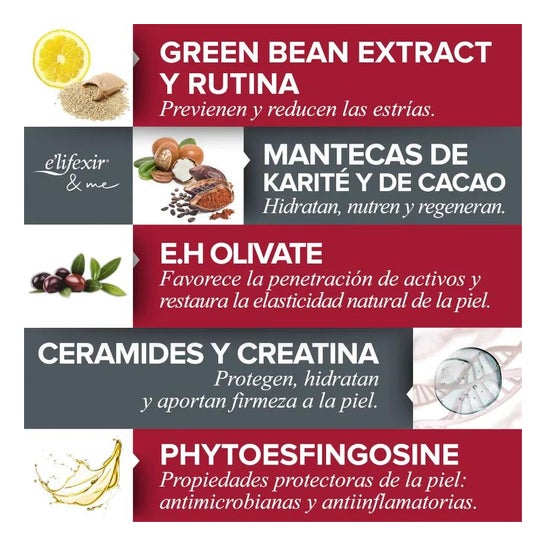 L'émulsion anti-vergeturesE'Lifexir®est une crème qui donne à la peau toute l'élasticité dont elle a besoin pour retrouver son apparence habituelle. Il s'agit d'un traitement innovant à triple action : il prévient, répareet ralentit la formation de vergetures sur la peau. Il aide à prévenir la formationde nouvelles vergetures, réduit leur profondeur de 72 % et maximise la formation de collagène.
