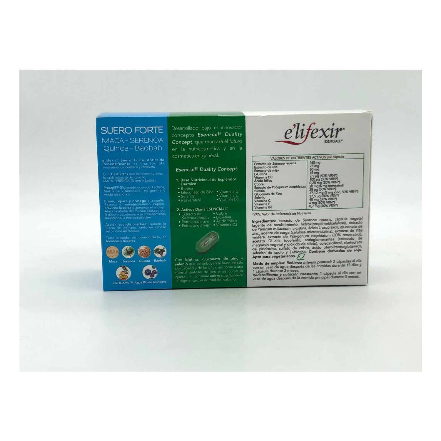 E'lifexir Hair Redensifying 2x30caps est un pack épargne contenant 60 gélules du complément alimentaire E'lifexir Hair Redensifying. Il associe de l'extrait de palmier nain, de raisin, de millet, de la vitamine D3 et de la L-cystine. Il apporte des nutriments qui renforcent et améliorent l'état des cheveux. Il favorise également la synthèse des protéines, protège contre les dommages oxydatifs, aide à normaliser l'activité hormonale et à contrôler le stress, principales causes de la chute des cheveux.