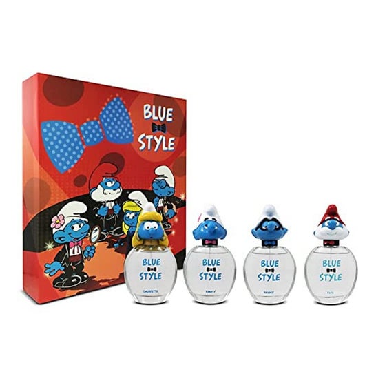 Pack Blue Style qui comprend quatre parfums pour enfants inspirés des plus célèbres personnages des Schtroumpfs. Chaque parfum a une odeur différente et un caractère qui le distingue, idéal pour les collectionner même lorsque le contenu est épuisé. Ce pack comprend le Grand Schtroumpf, la Schtroumpfette, le Schtroumpf Vanité et le Schtroumpf Philosophe.