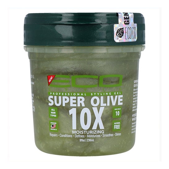 Eco Styler Super Olive 10X Gel Fixatif Sans Alcool Fort 236ml est un gel professionnel conçu pour la définition et la fixation des cheveux, offrant une finition durable sans résidus ni sensation collante.