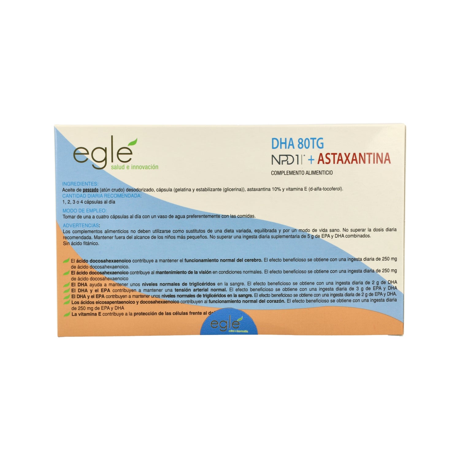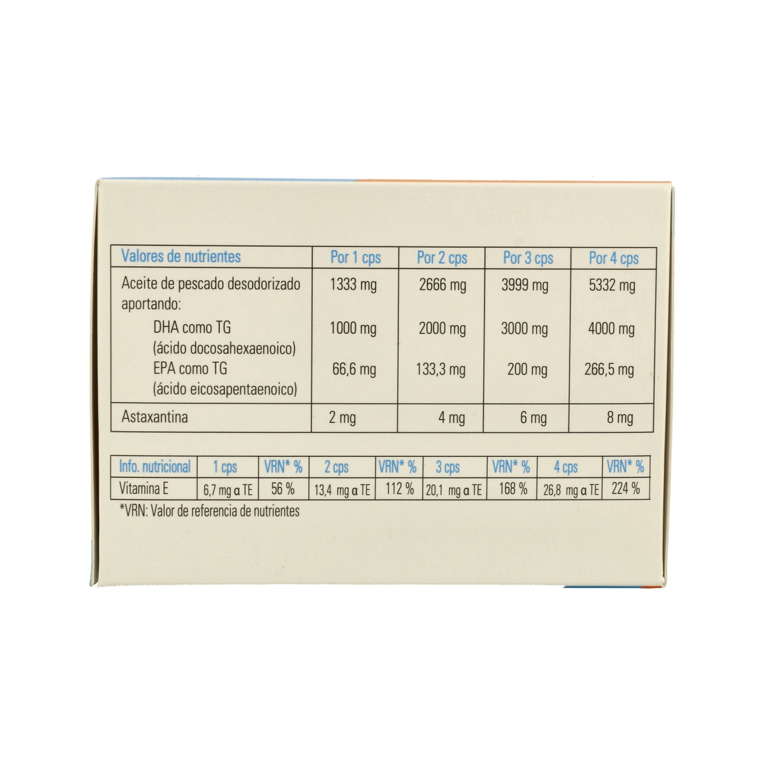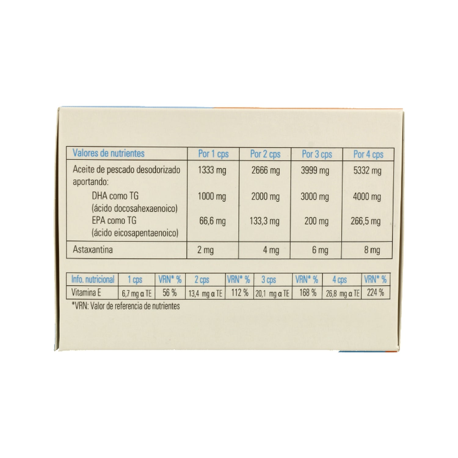 Complément alimentaire à base de DHA et d'astaxanthine. Idéal pour les troubles cognitifs légers, le déficit d'attention chez les enfants, un large éventail de pathologies oculaires, œil sec, rétinite pigmentaire, DMLA, etc., le profil lipidique ou l'hypertriglycéridémie.
