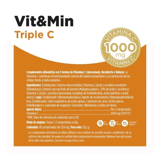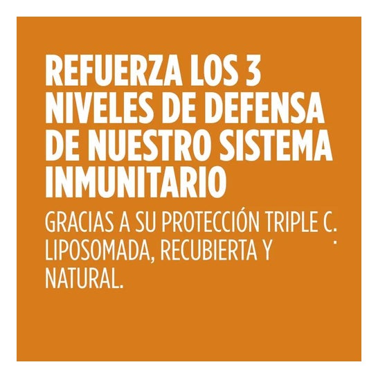 Complément alimentaire sous forme de comprimés, contenant trois formes de vitamine C issue de l'acérola (liposomale, enrobée et naturelle), qui contribue à renforcer le système immunitaire et à protéger les cellules des dommages oxydatifs. Se présentant sous trois formes, il a trois temps d'absorption différents dans l'organisme, ce qui permet d'éviter les niveaux de saturation dans le plasma et d'obtenir une plus grande concentration et durée dans le sang.