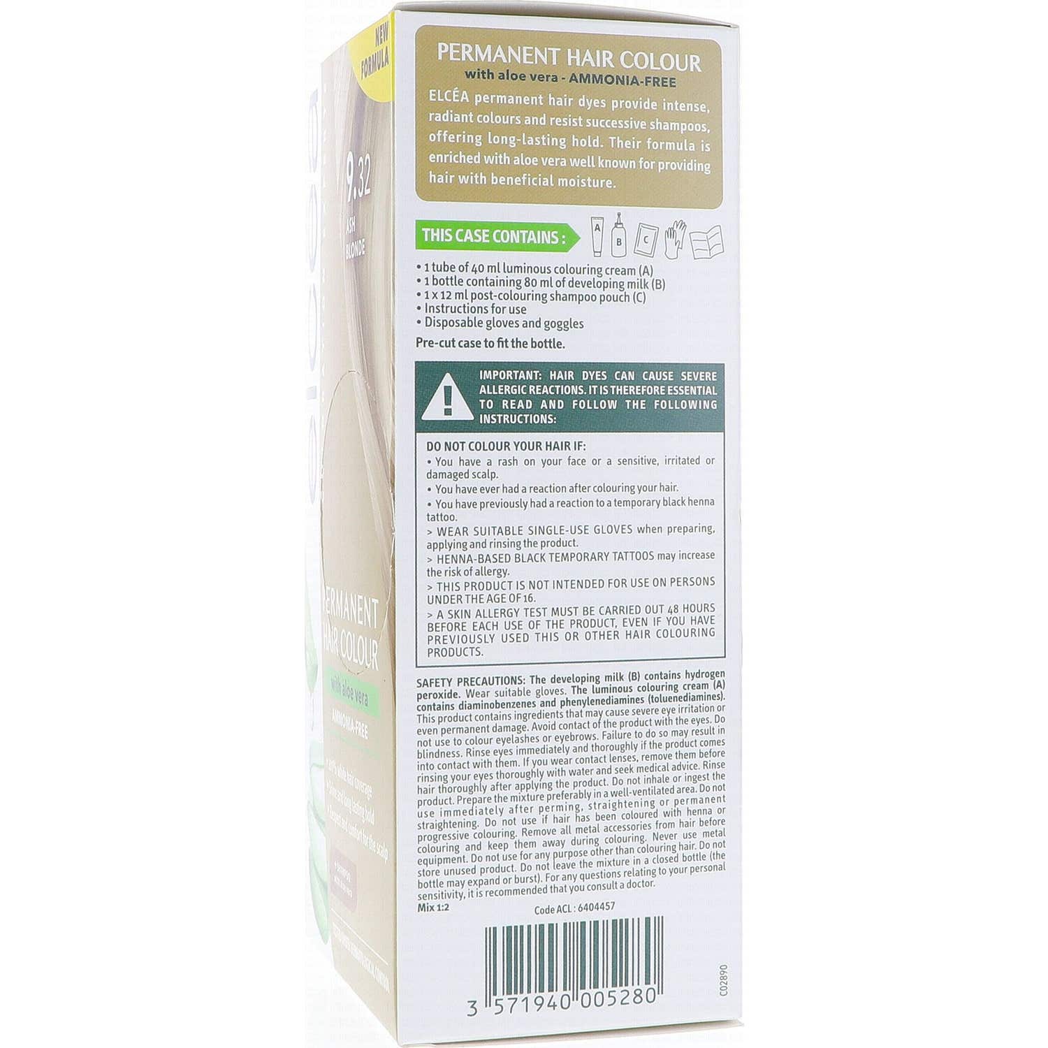 Elcea Coloration Permanente Aloe Vera 9.32 Blond Cendré est un produit phare de la marque ELCEA, reconnue pour sa haute qualité en coloration capillaire. Cette crème de coloration se caractérise par sa texture crémeuse, ce qui facilite une application uniforme sur l'ensemble des cheveux.