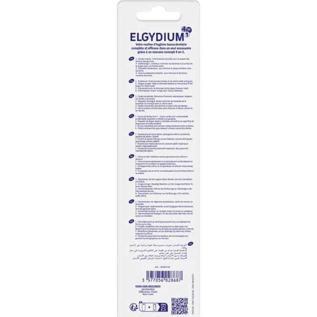 Elgydium Brosse à Dents 4 en 1 Moyenne est une brosse à dents conçue pour offrir une hygiène buccale intégrale. Ce produit dispose de quatre zones de poils différenciées qui remplissent diverses fonctions :