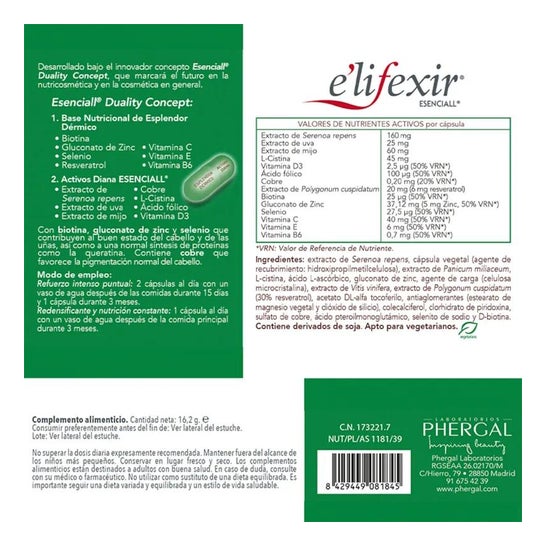 Contenido Interno : Extracto De Serenoa Repens, Extracto De Mijo, L-Cistina, Agente De Carga (E-460), Ácido L-Ascórbico, Gluconato De Zinc, Extracto De Uva, Extracto De Polygonum Cuspidatum (30% Resveratrol), Acetato Dl-Alfa Tocoferilo, Antiaglomerante (E-470b), Estabilizante (E-551), Colecalciferol, Clorhidrato De Piridoxina, Sulfato De Cobre, Ácido Pteroilmonoglutámico, Selenito De Sodio, D-Biotina. Cápsula : Gelatina, Colorantes (E-171, E-172, E-132). Contiene Derivados De Soja.