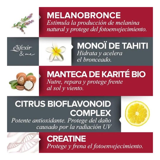 E'lifexir Piel Canela Intensificador Bronceado SPF30 150ml est une crème corporelle biomimétique qui contribue à intensifier le bronzage, grâce à son composé activant Melanobronze. De plus, elle offre une large protection contre les rayons UVA, UVB et IR-A grâce à ses filtres SPF30.