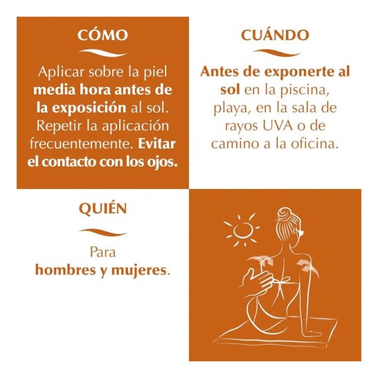 Appliquer Elifexir Piel Canela sur la peau une demi-heure avant l'exposition au soleil. Répéter l'application fréquemment. Éviter le contact avec les yeux. Si ta peau en a besoin, tu peux appliquer ensuite un facteur de protection plus élevé.