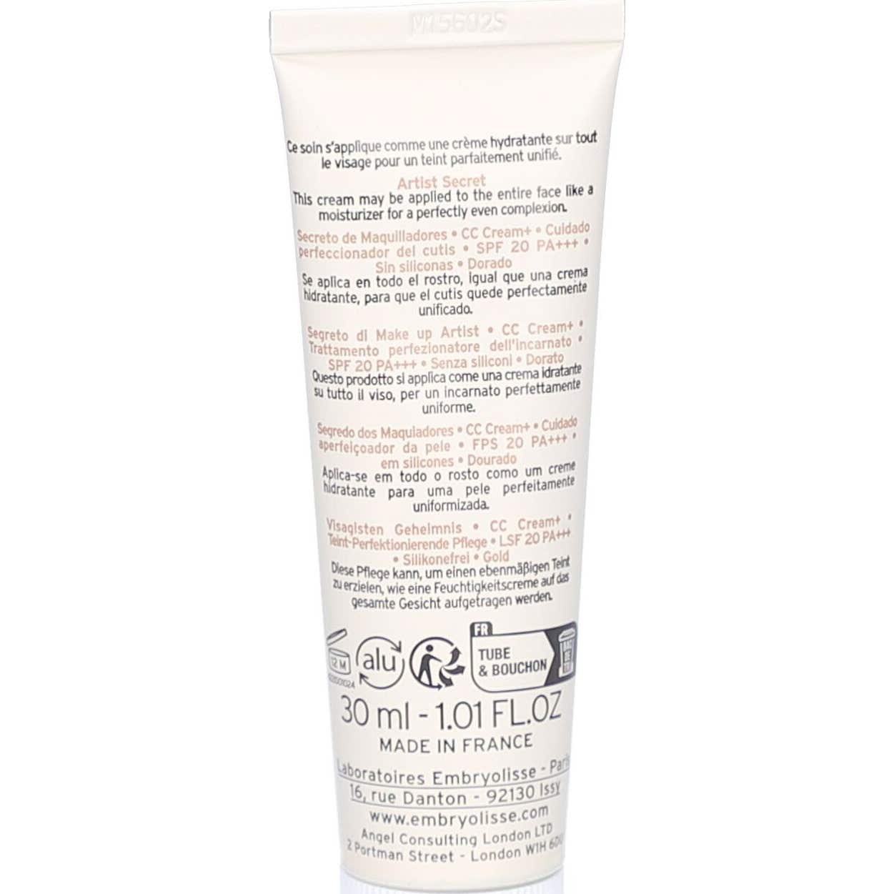 Embryolisse CC Cream+ Spf20 Doré 30 ml est un produit innovant qui combine les propriétés du maquillage et des soins de la peau. Cette crème perfectrice du teint est formulée avec 94% d'ingrédients d'origine naturelle, à l'exception des filtres solaires. Sa formule légère et non comédogène est sans silicone et convient aux végans.