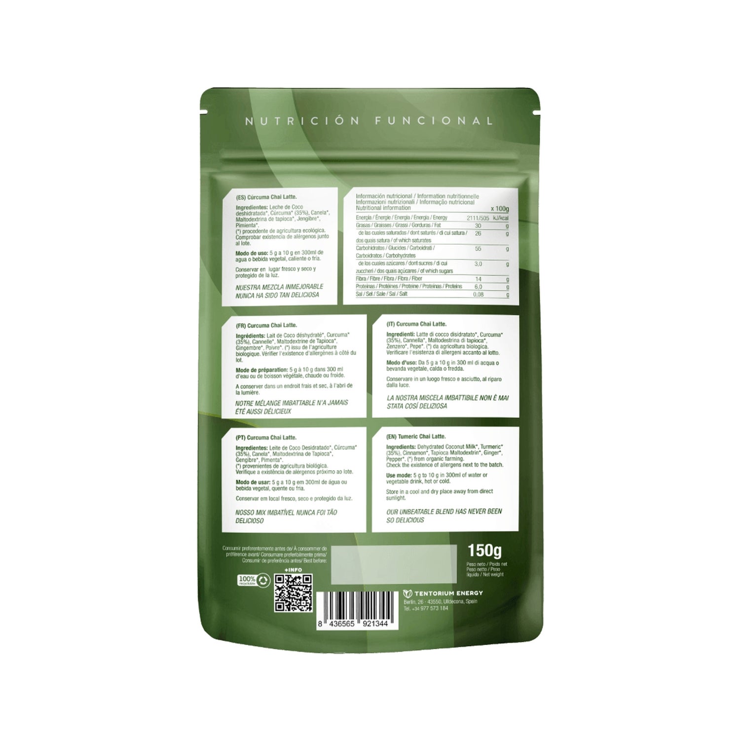 Poudre pour la préparation de shakes chauds et froids formulée avec du curcuma 100% biologique. Il possède des propriétés anti-inflammatoires et antioxydantes qui contribuent à réduire la sensation de fatigue et à améliorer les performances physiques et intellectuelles. Il contribue également à renforcer la protection cellulaire contre les agents extérieurs et l'excès de radicaux libres. Il peut également être utilisé dans les préparations pâtissières, les pâtisseries, les gâteaux et les pains. Enrichi en lait de coco séché, cannelle, poivre noir et gingembre, qui favorisent le fonctionnement du système immunitaire. Exempt de gluten, de colorants artificiels, d'édulcorants et d'allergènes. Testé cliniquement.