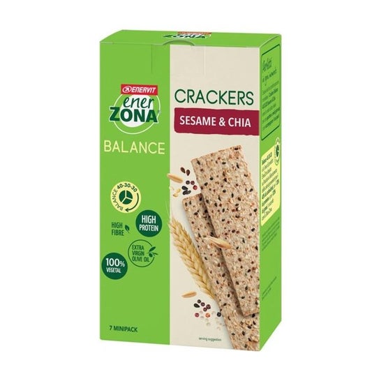 Crackers avec sésame et graines de chia. Ils sont une riche source de protéines et de fibres, ce qui favorise le bon fonctionnement du système intestinal. Ils ont une croûte croustillante et la taille idéale pour les snacks et les tapas. Recommandé pour accompagner le houmous, les sauces, le guacamole, les plateaux de fromage et les viandes froides.