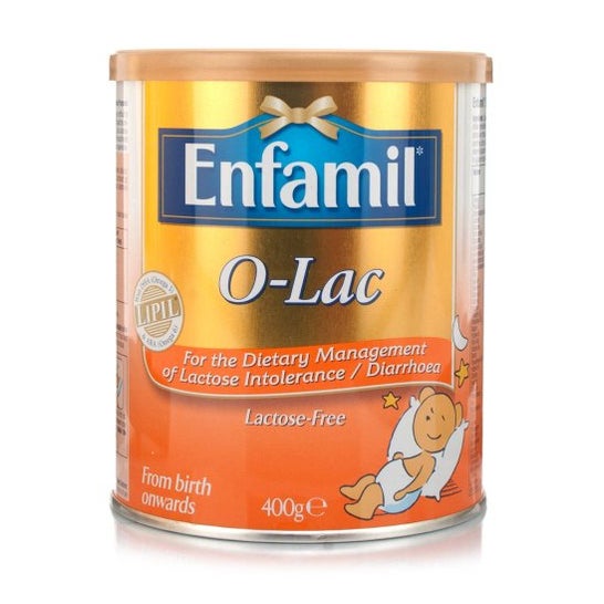 Lait infantile pour les régimes en cas d'intolérance au lactose et de diarrhée, en boîte de 400g format. Le produit aide à réduire et à traiter les problèmes de digestion chez les nourrissons. La préparation en poudre Enfamil O-Lac est un aliment spécial à base de lait de vache, nutritionnellement complet et sans lactose, destiné aux bébés qui ne tolèrent pas le lactose (sucre du lait1) et qui présentent des symptômes tels que des coliques, des ballonnements et des diarrhées.