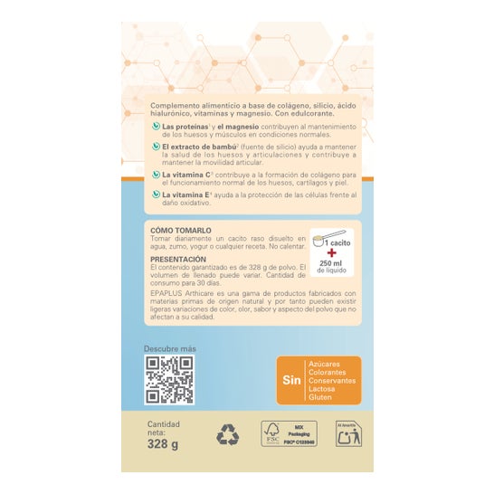 Epaplus Arthicare Collagène Silice Vanille Poudre 30 Jours est un complément alimentaire avec édulcorants composé de collagène, de silicium, d'acide hyaluronique et de vitamines.