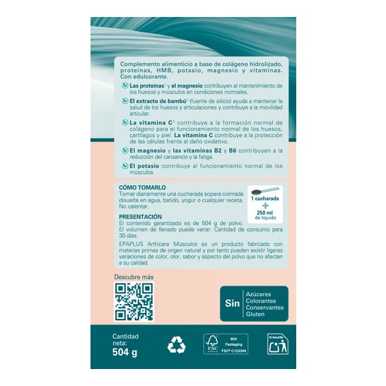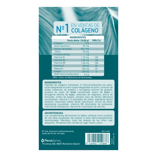 Complément alimentaire qui aide à la flexibilité et à la mobilité articulaire grâce à son contenu en collagène hydrolysé, silice (extrait de bambou), acide hyaluronique, magnésium, vitamine C, vitamine E et vitamines B1, B2 et B6. Nous avons renforcé sa formule avec des protéines sériques, HMB (acide β-hydroxy bêta-méthylbutyrique) et potassium.