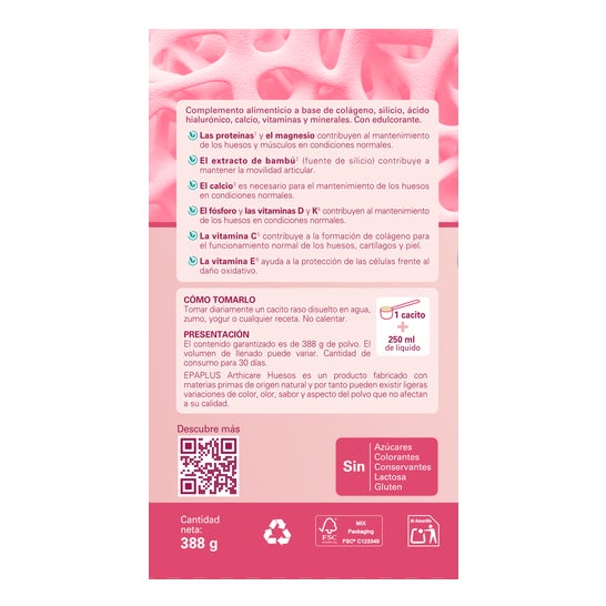 Epaplus Arthicare Os Collagène Antiox Vanille 388g est un complément alimentaire à base de collagène hydrolysé, silicium (extrait de bambou), calcium, acide hyaluronique, magnésium, vitamine C, vitamine D3, vitamine K2, phosphore, vitamines B1, B2 et B6 et, maintenant aussi vitamine E, indiqué pour les adultes qui cherchent à maintenir et augmenter leur masse musculaire, et à avoir des os et des articulations en conditions optimales.