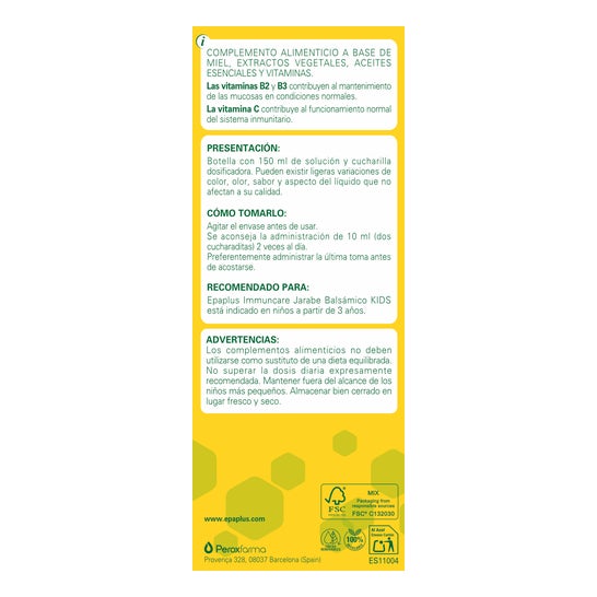 Sirop balsamique Epaplus Enfants 150ml sirop balsamique idéal pour les enfants avec des ingrédients d'origine naturelle. Sa formule à base de miel, d'acérola, de vitamine C, de vitamine B2 et de vitamine B3 aide à combattre le rhume par la toux et a également un effet relaxant sur la gorge, le pharynx et les cordes vocales.