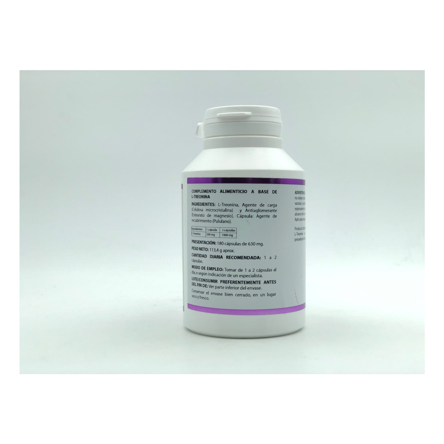 Complément alimentaire à base de L-thréonine qui contribue à la formation des protéines, du collagène, de l'élastine et de l'émail des dents. Elle est nécessaire à la production de neurotransmetteurs et, par conséquent, à la santé du système nerveux. Formulé avec de la L-thréonine qui aide à métaboliser les graisses et à améliorer la synthèse du collagène naturel. Intervient dans le cycle de formation de l'élastine et aide à la formation de l'élastine. Il aide à augmenter la production d'enzymes digestives et à réguler le système nerveux. Les compléments alimentaires ne doivent pas être utilisés comme substitut d'une alimentation variée et équilibrée. Ne pas dépasser la dose journalière expressément recommandée. Tenir hors de portée des jeunes enfants. 50 capsules de 630 mg.