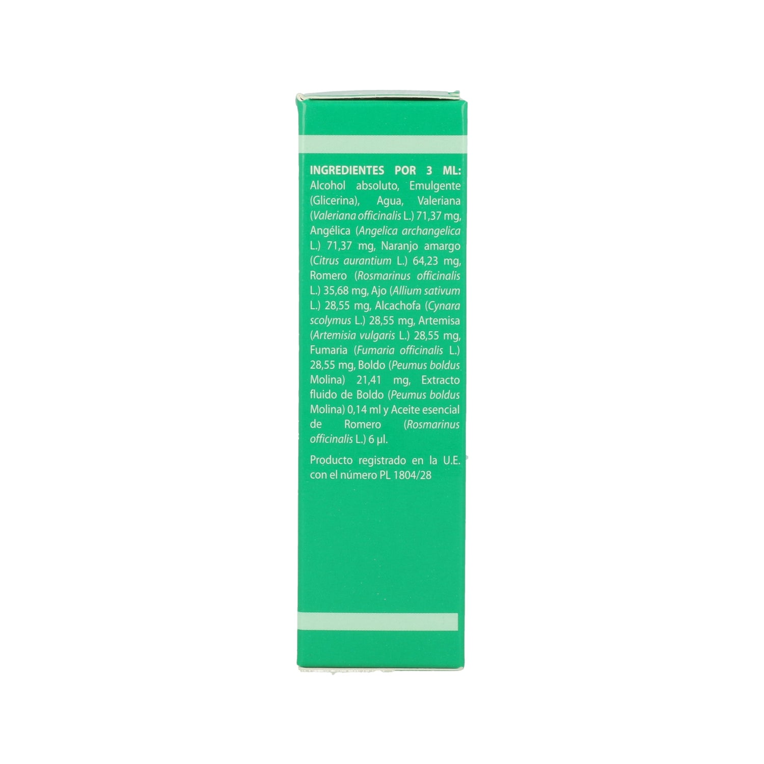 Enrichi en angélique, ail, écorce d'orange, artichaut, artichaut, boldo, romarin, fumariose et armoise, il a une action drainante hépatique.
