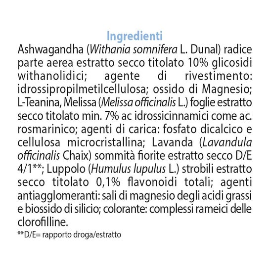 Complément alimentaire présenté sous forme de capsules, ce qui aide à lutter contre le stress physique et mental. Il favorise la relaxation et le bien mental - être naturellement. Il est composé d'ingrédients actifs: Ashwagandha, fournit une relaxation et bien être à l'esprit; Melisa, réduit les états d'agitation, de tension et d'instabilité émotionnelle; Le houblon, un effet apaisant sur le système nerveux; Lavande, soulage les symptômes légers de stress mental et d'épuisement; L-Teaanina, assure la relaxation; Le magnésium, contribue au fonctionnement normal du système nerveux. Convient à l'âge de 18 ans. APT pour les végétaliens et les cœliaques. Ne prenez pas pendant la grossesse ou l'allaitement.