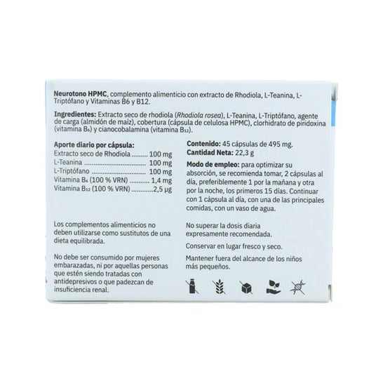 Espadiet Neurotono HPMC 45caps est un complément formulé à base de tryptophane, rhodiola et théanine qui aide à contrôler les états de nervosité. En conséquence, ses bienfaits pour l'organisme se traduisent par une amélioration de la vitalité, facilitent la résistance de l'organisme au stress, améliorent la mémoire et la concentration, contribuent à une circulation sanguine normale et aident à obtenir un sommeil normal. Présentation 45 capsules.