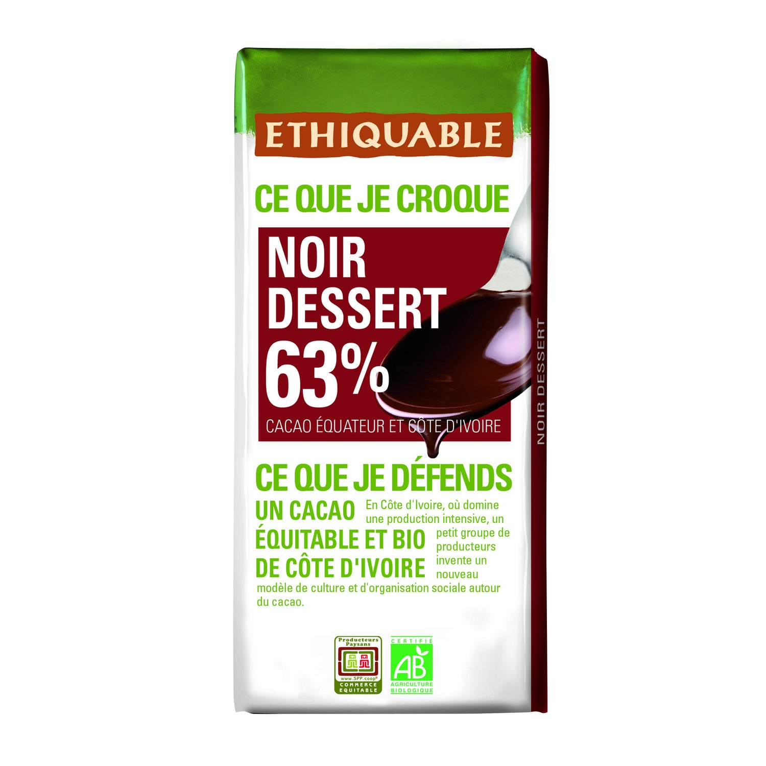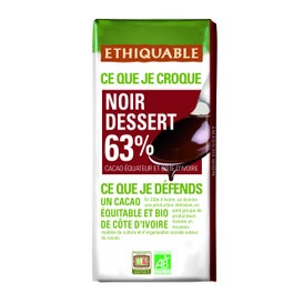 Chocolat noir à fondre, fabriqué avec 63% de cacao issu de l'agriculture biologique et combinant la variété de chocolat de l'Équateur et de la Côte d'Ivoire. Il est idéal à inclure dans la cuisine gastronomique pour la préparation de divers desserts. Sa marque Ethiquable s'efforce de promouvoir une agriculture durable et respectueuse de l'environnement, en travaillant avec des coopératives locales de petits agriculteurs et en respectant le commerce équitable.