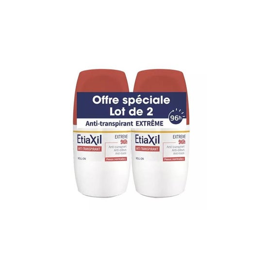 Etiaxil Anti-Transpirant Extrême 96H 2x50 ml est un produit conçu pour offrir une protection efficace contre la transpiration modérée pendant une période allant jusqu'à 96 heures. Cette présentation comprend un lot de deux roll-ons de 50 ml chacun, garantissant une utilisation prolongée.