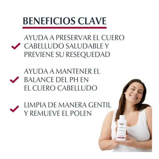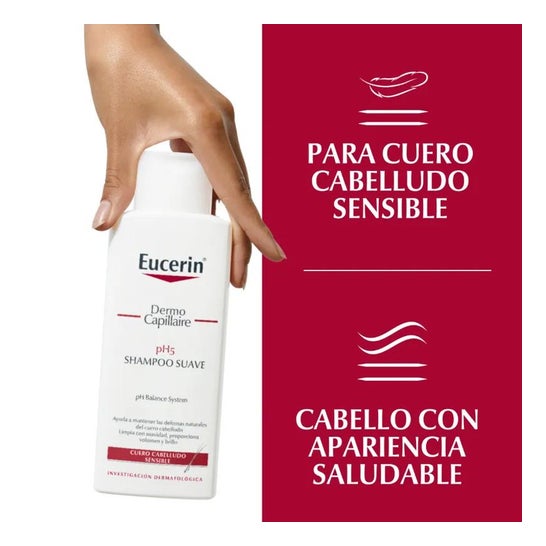 Le Shampoing doux ph5 Dermo capillaire des laboratoires Eucerin a une formule douce sans savon qui prévient de toutes les irritations ainsi que la sécheresse du cuir chevelu. Ce Shampoing doux ph5 aide à éliminer, de manière efficace, le pollen et les autres allergènes résiduels. De plus,ce shampoing des laboratoires Eucerin améliore l'état du cuir chevelu et contribue à son bon équilibre : maintient le manteau acide protecteur de la peau lave en douceur le cuir chevelu et les cheveux procure brillance naturelle et souplesse aux cheveux.